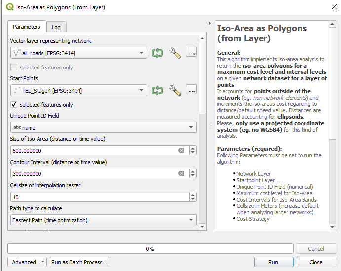 We utilise Iso-Area from QNEAT3 Plugin for QGIS to calculate the fastest path based on the speed of 3.6km/h based on the LTA report1 . The size of ISO-Area is in time value of 600 seconds (10 Minutes) and the Contour Interval at 300 seconds (5 minutes). Vector layers will be utilizing OSM geofabrik roads network layer and TEL Stage 4 stations from clipped geofabrik transport layer.
